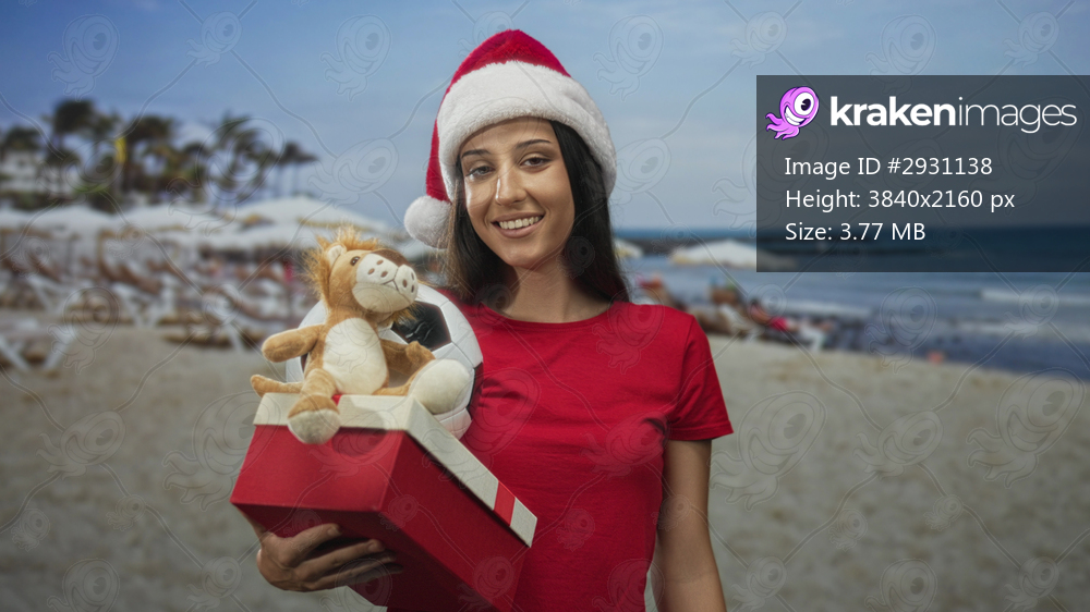 Woman holding gift box with stuffed lion and soccer ball at beach wearing santa hat and red shirt; holiday joy.