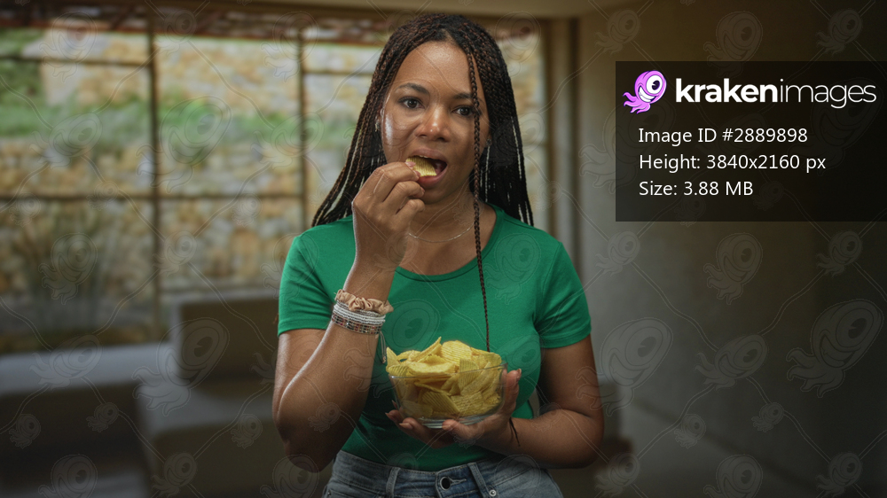 Woman holding glass bowl of chips with finger to lips for silence in a building living room; thoughtful pause.