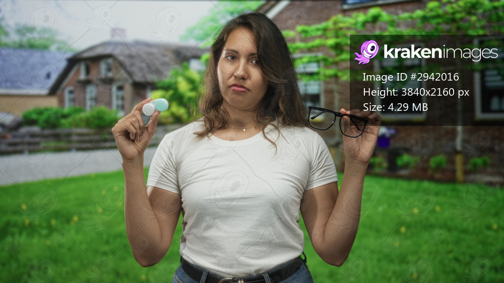 Woman holding glasses and contact lens case at building entrance with puzzled expression; eyewear indecision.