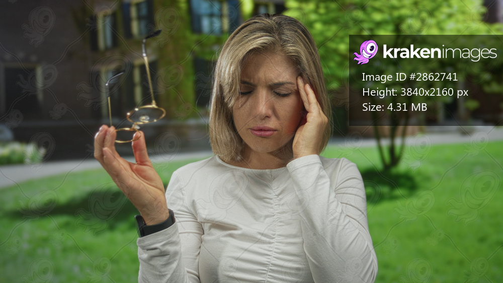 Woman holding glasses in one hand and clutching her temple with the other while standing in front of a building covered in ivy outdoors; stress.