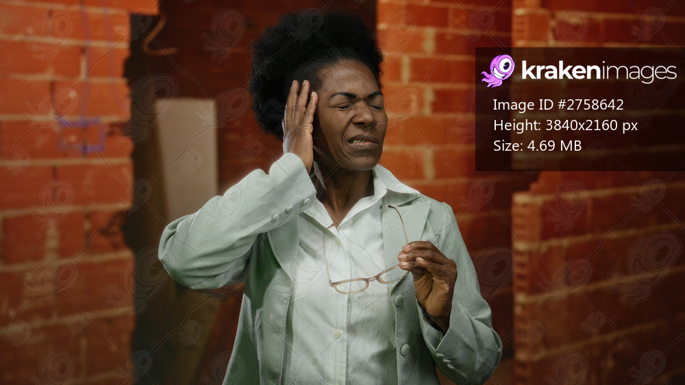 Woman holding glasses looking stressed against unfinished brick construction wall at indoor site.