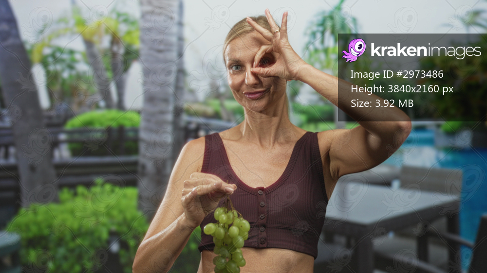 Woman holding grapes with bare hand making ok sign in building poolside area; playful wellness vitality.