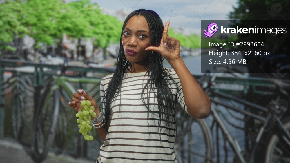 Woman holding grapes in hand on street by canal bridge with bicycles and railing, striped shirt and braids visible; playful confidence.