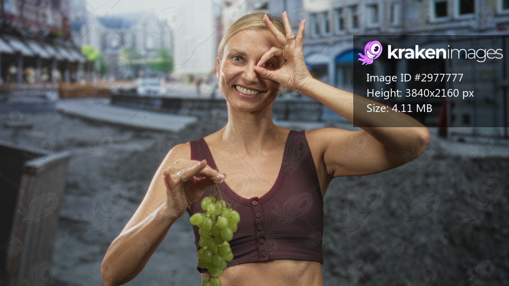 Woman holding grapes makes ok sign with hand over eye on a city street in workout top, middle aged blonde smiling; playful joy.