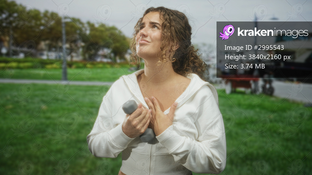 Woman holding gray dumbbell to chest with hand pressed to chest, wearing white hoodie while standing in street park near marina; vulnerability recovery. - Kraken Images