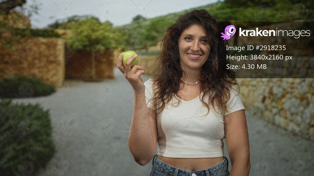 Woman holding green apple by raised hand on stone street with a terraced wall and shrubs; healthy living contentment.