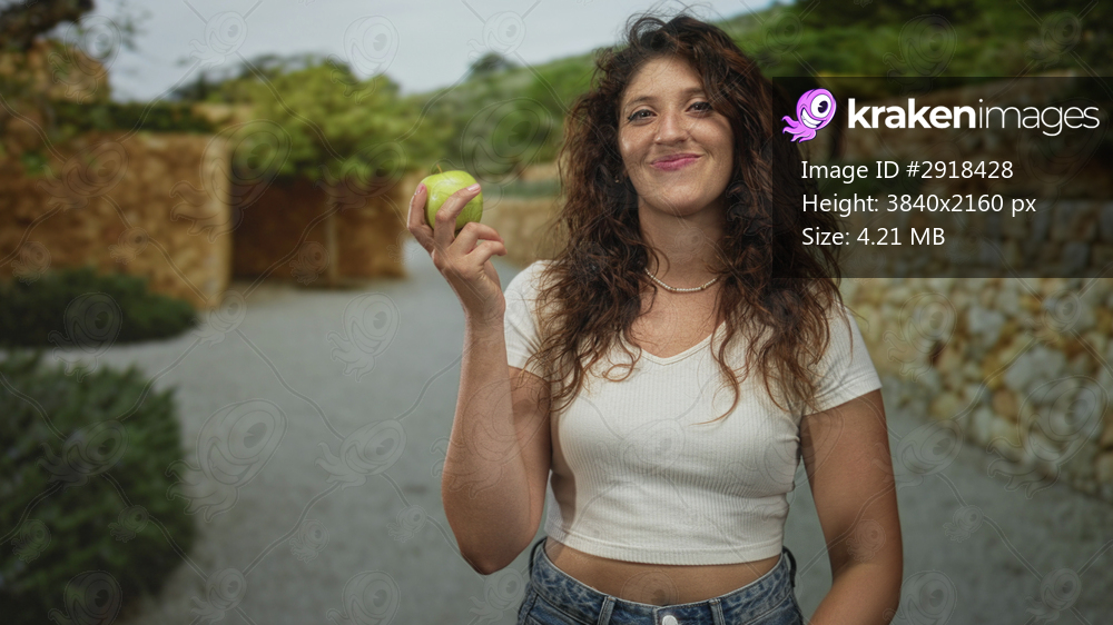 Woman holding green apple by raised hand on stone street with a terraced wall and shrubs; healthy living contentment.