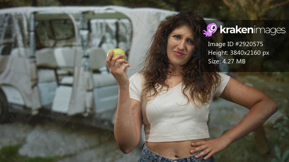 Woman holding green apple and clutching stomach in forest near parked cart at dusk; discomfort hesitation.
