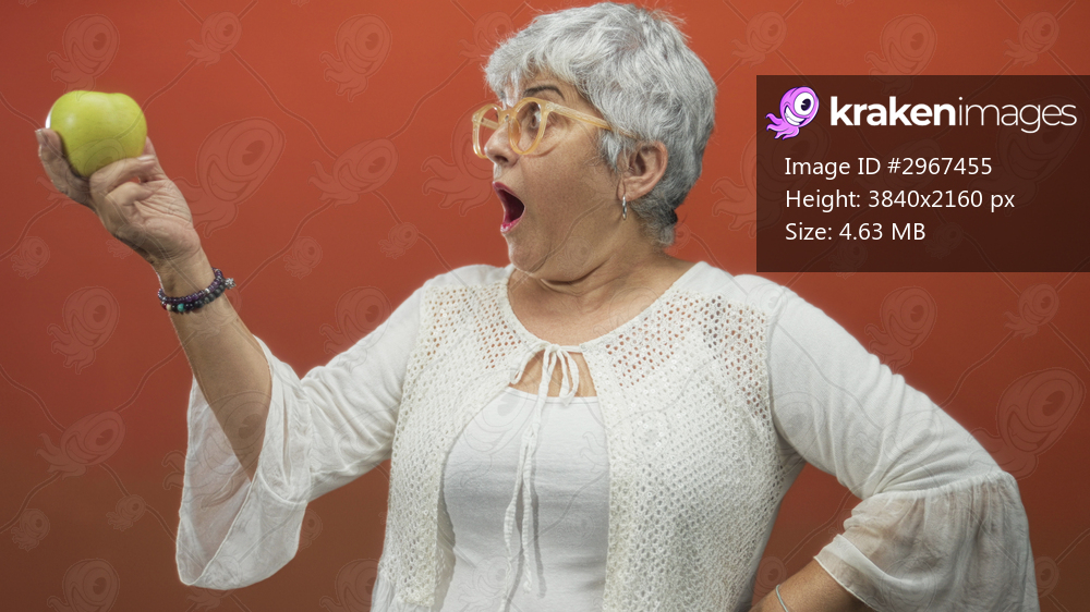 Woman holding green apple high, hand raised with open mouth and hand on hip, studio; playful surprise.
