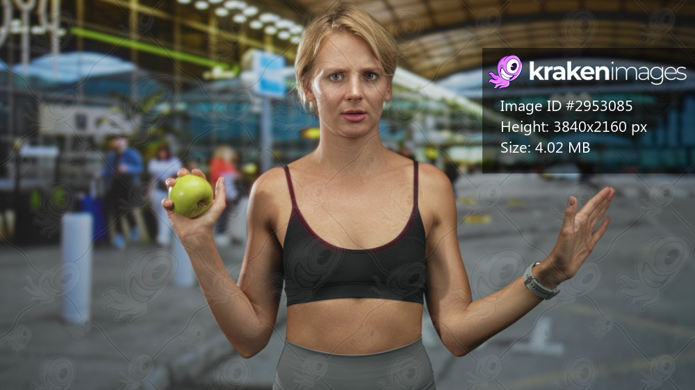 Woman holding green apple and pointing finger with closed eyes at airport; healthy choice disapproval.