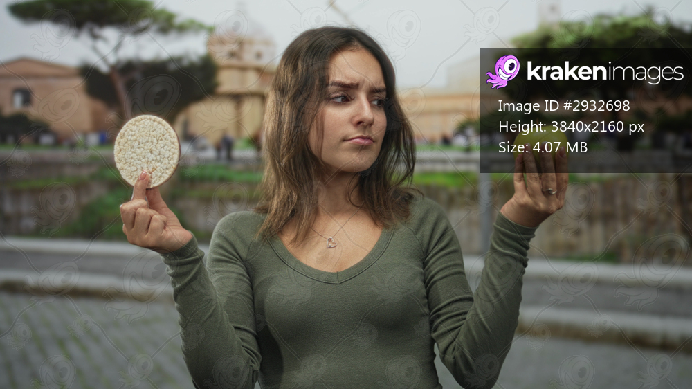 Woman holding green apple and rice cake in cobblestone street by building, holding both hands out to compare; indecision healthy choice.
