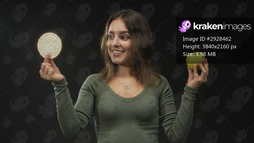 Woman holding green apple and rice cake, smiling while comparing choices in studio; healthy choice optimism.