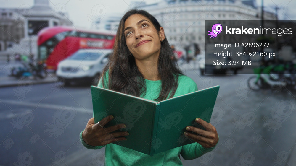 Woman holding green book and smiling on busy street with closed eyes and visible hands gripping the open book; reading calm.