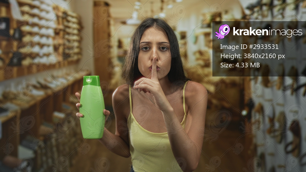 Woman holding green bottle and finger to lips for silence in building shoe store aisle; silence secrecy.