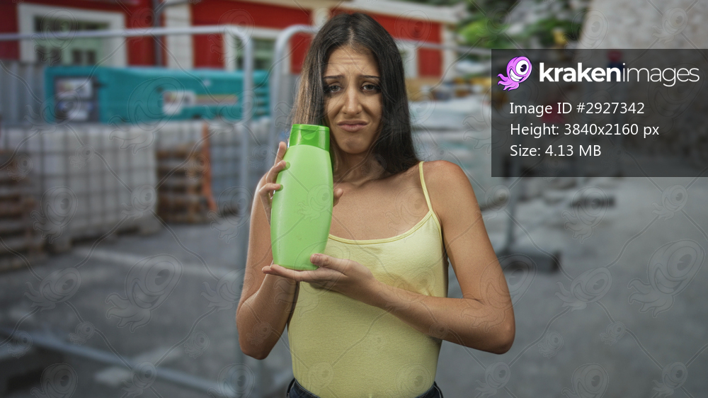 Woman holding green bottle and grimacing at a construction site outdoors; product safety concern disgust.