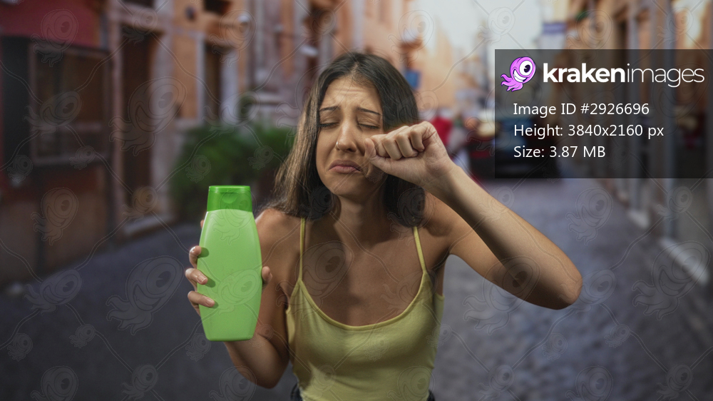 Woman holding green bottle rubs eye with fist on street, bare shoulder visible; irritation tiredness.