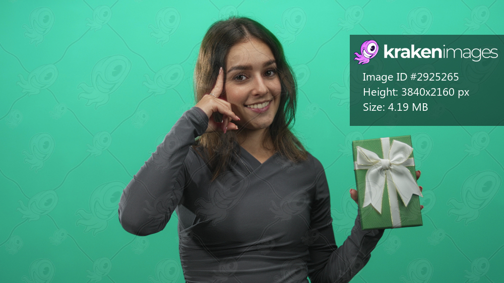 Woman holding green gift box with finger to temple gesture against green studio wall; thoughtful surprise idea.