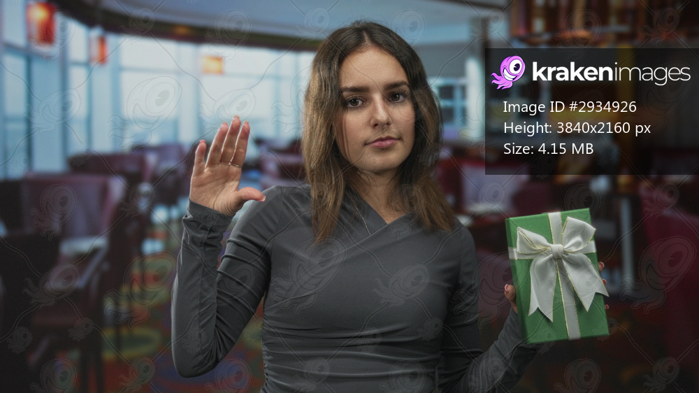 Woman holding green gift box with white bow and waving open right hand in restaurant dining area with tables; quiet celebration.