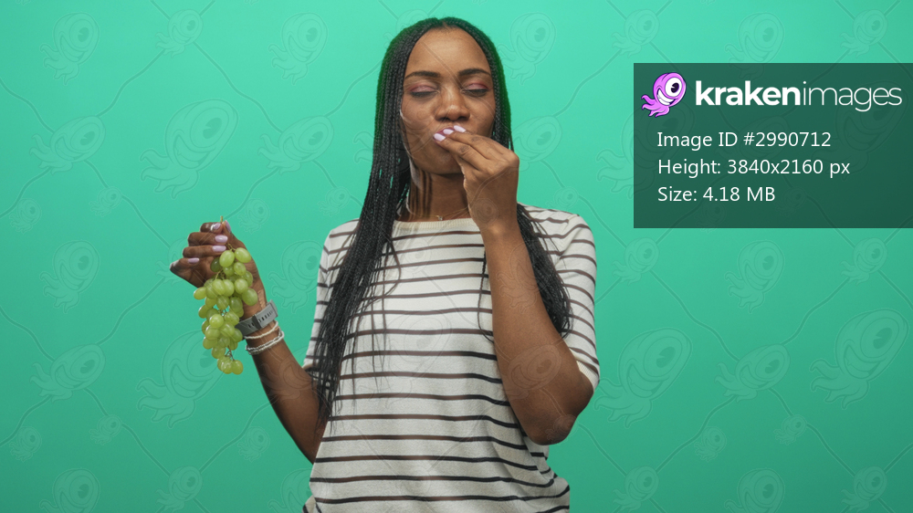 Woman holding green grape bunch by hand in studio with striped shirt, bracelets and watch; joy healthy eating.