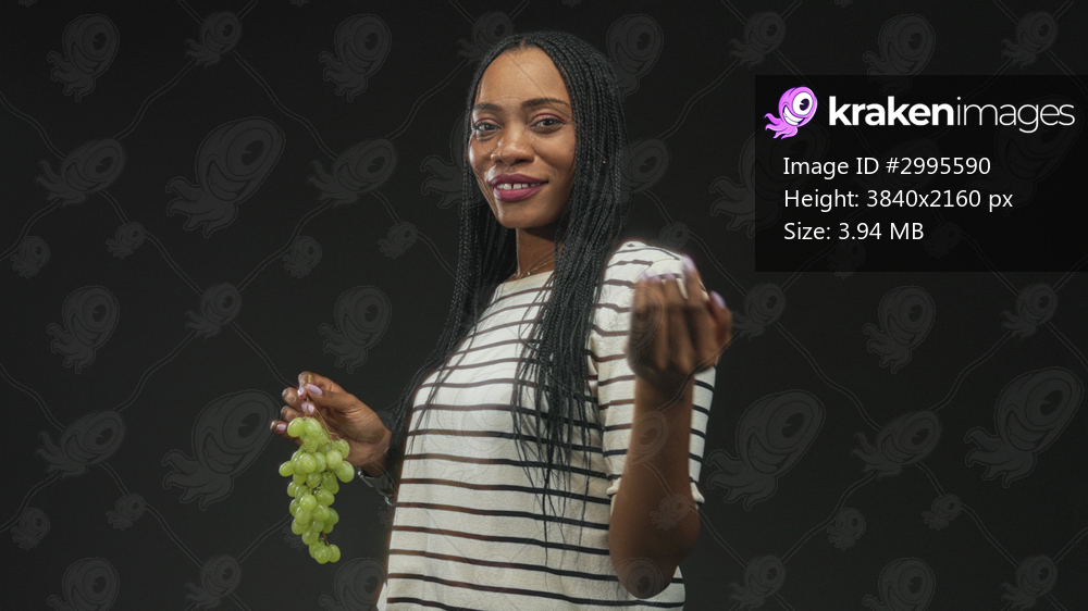 Woman holding green grapes, extends hand beckoning with palm up in studio, striped shirt and braided hair; invitation friendly.