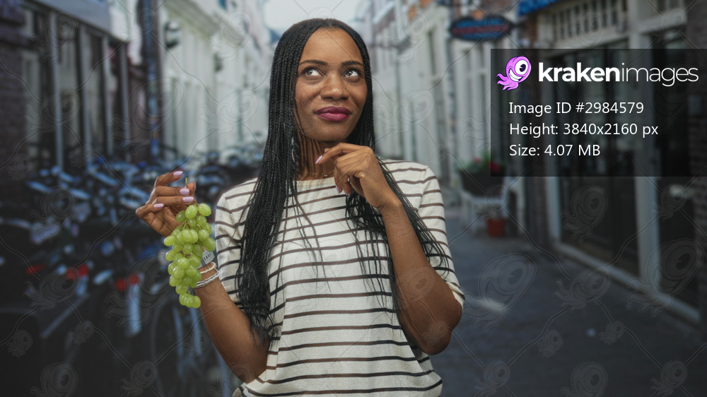 Woman holding green grapes, finger to chin gesture on a narrow street lined with bicycles and storefronts; contemplation curiosity.