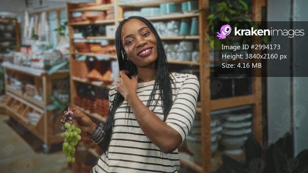 Woman holding green grapes, fingers brushing hair amid wooden shelves in a shop building; casual joy.