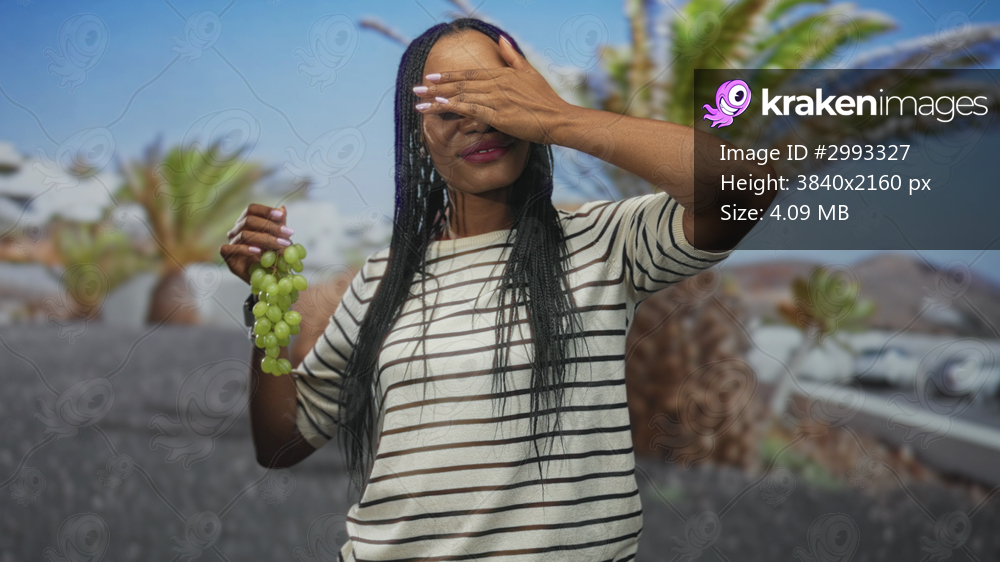 Woman holding green grapes with hand covering eyes, striped shirt and braided hair, palm trees and parked cars on street; playful.