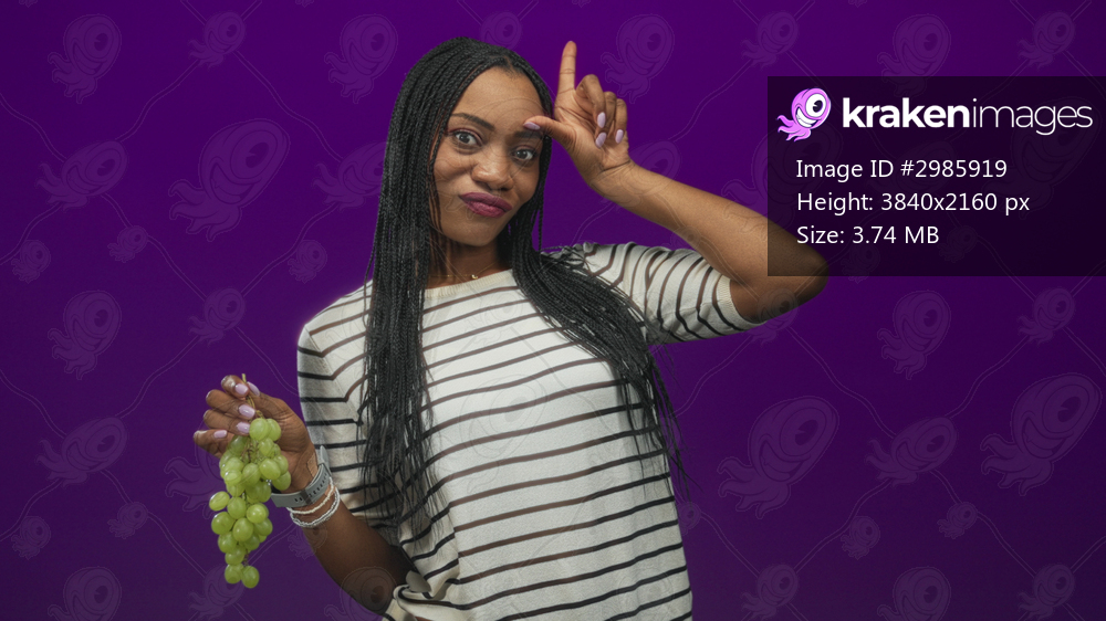 Woman holding green grapes and pointing finger with her hand toward camera in a studio purple backdrop, striped shirt visible; playful.