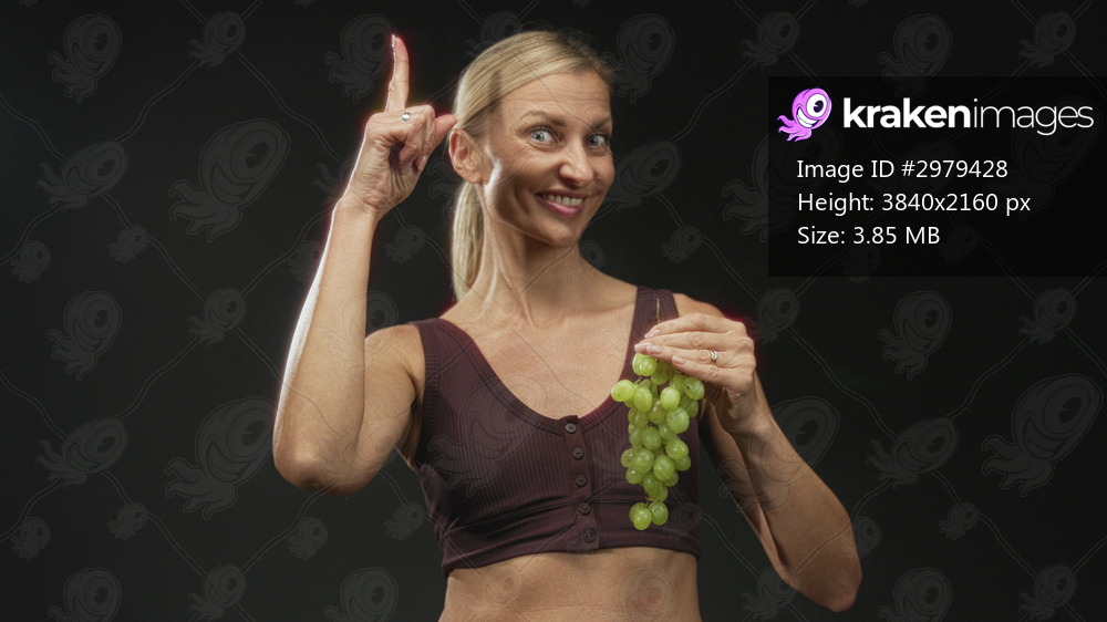 Woman holding green grapes, pointing index finger up in studio while smiling in sports top; health wellness joy.