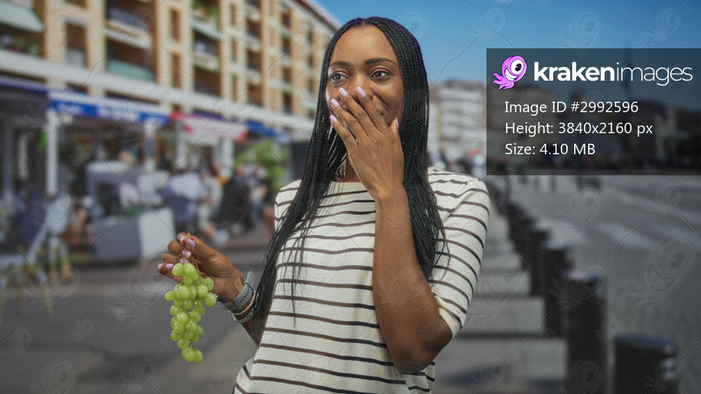 Woman holding green grapes and wearing striped shirt covers mouth with hand while standing by outdoor cafes and bollards on street; surprise delight.