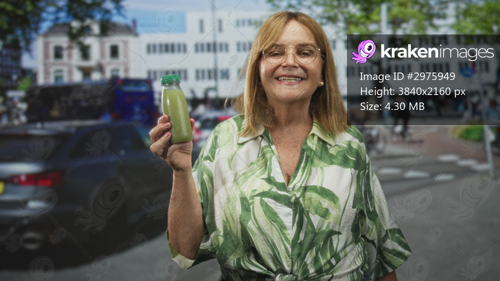 Woman holding green juice bottle, sniffing near nose and smiling on a street with cars and cyclists; curiosity wellness.