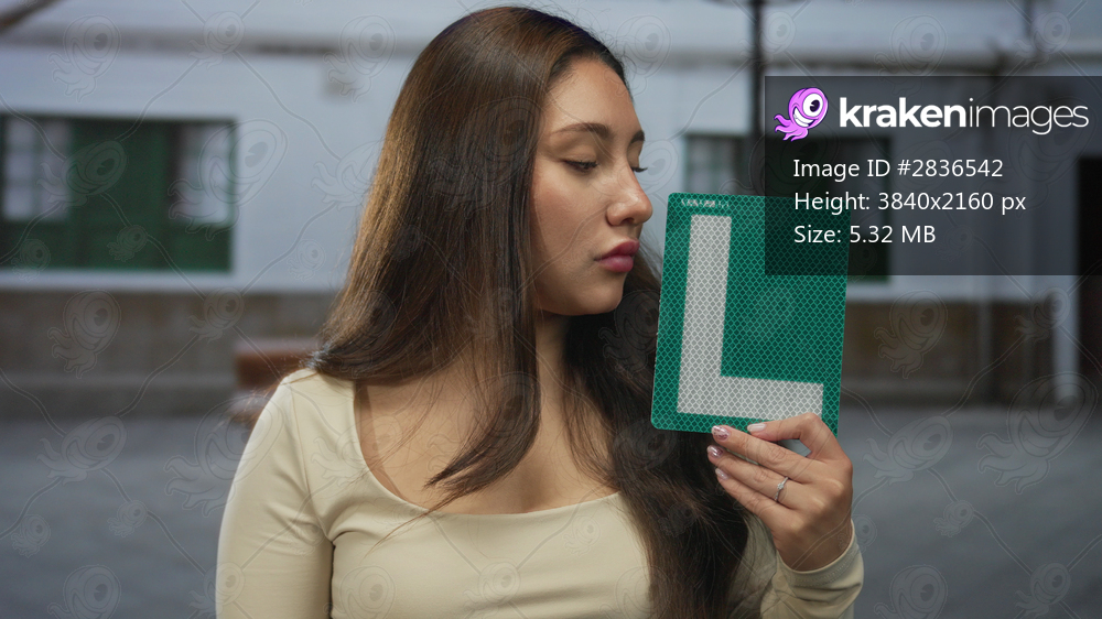 Woman holding green l sign in front of aged stone building facade during daylight; learning confidence ambition.