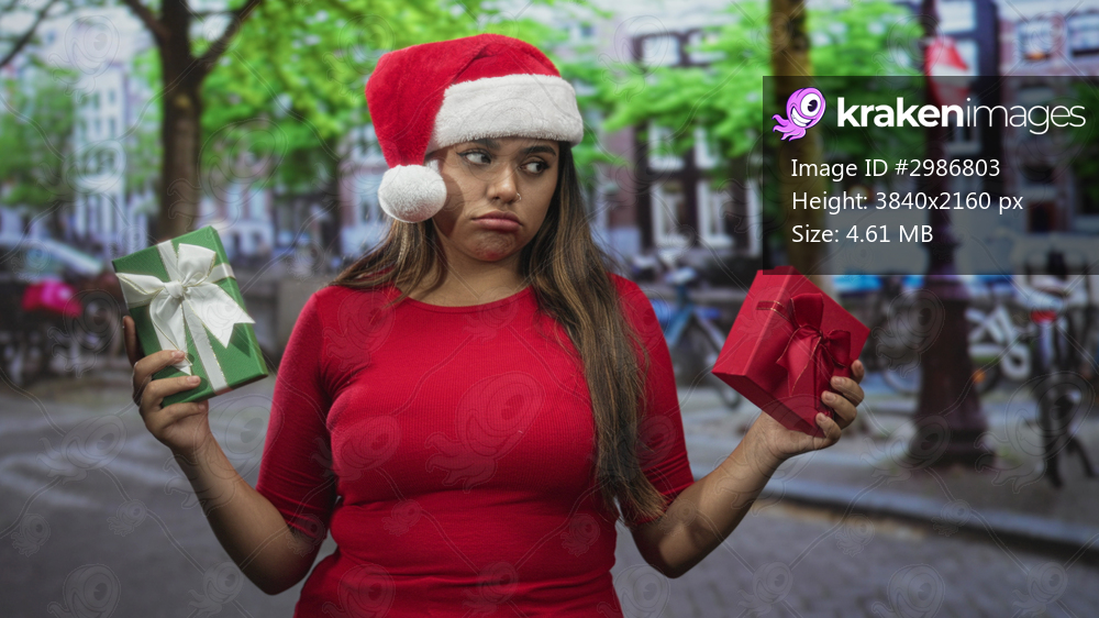 Woman holding green and red gift boxes, lips pouting, wearing santa hat and red dress, stands with arms slightly raised on street; holiday frustration. - Kraken Images