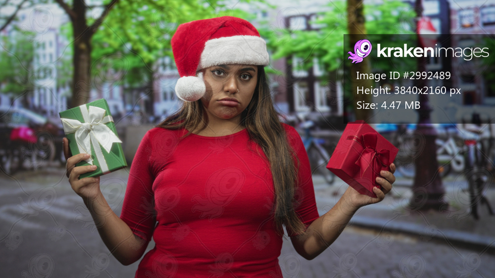 Woman holding green and red gift boxes, lips pouting, wearing santa hat and red dress, stands with arms slightly raised on street; holiday frustration. - Kraken Images
