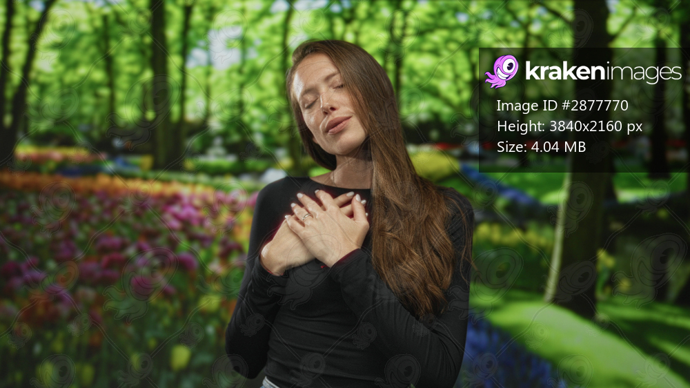 Woman holding hand to chest in a park with eyes closed, long hair flowing, surrounded by green trees and colorful flowerbeds and soft sunlight; gratitude serenity. - Kraken Images