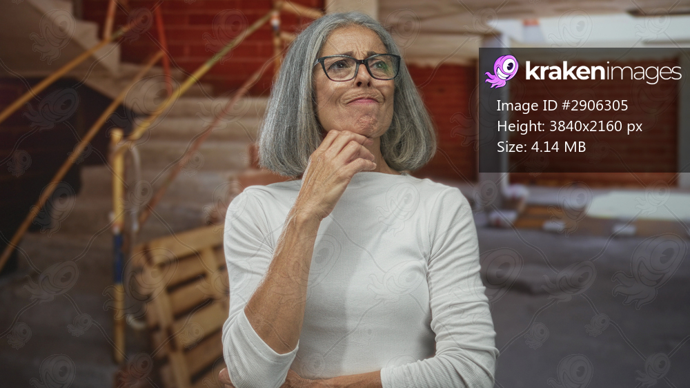 Woman holding hand to chin in unfinished building interior, wearing glasses and white top, framed near stairs and pallets; thoughtful contemplation.