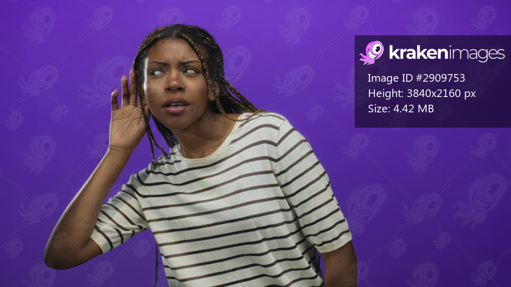 Woman holding hand to ear in a listening pose in purple studio wearing striped shirt and nose ring; curiosity communication.