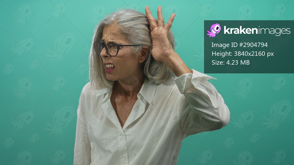 Woman holding hand to ear in turquoise studio with grey hair and glasses wearing white shirt; annoyance listening reaction.