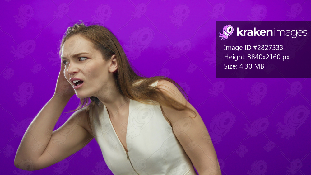 Woman holding hand to ear and leaning forward in a purple studio wearing a white sleeveless dress; confusion.