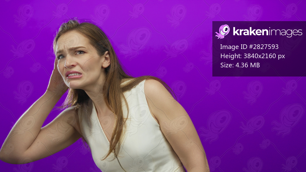 Woman holding hand to ear and leaning forward in a purple studio wearing a white sleeveless dress; confusion.