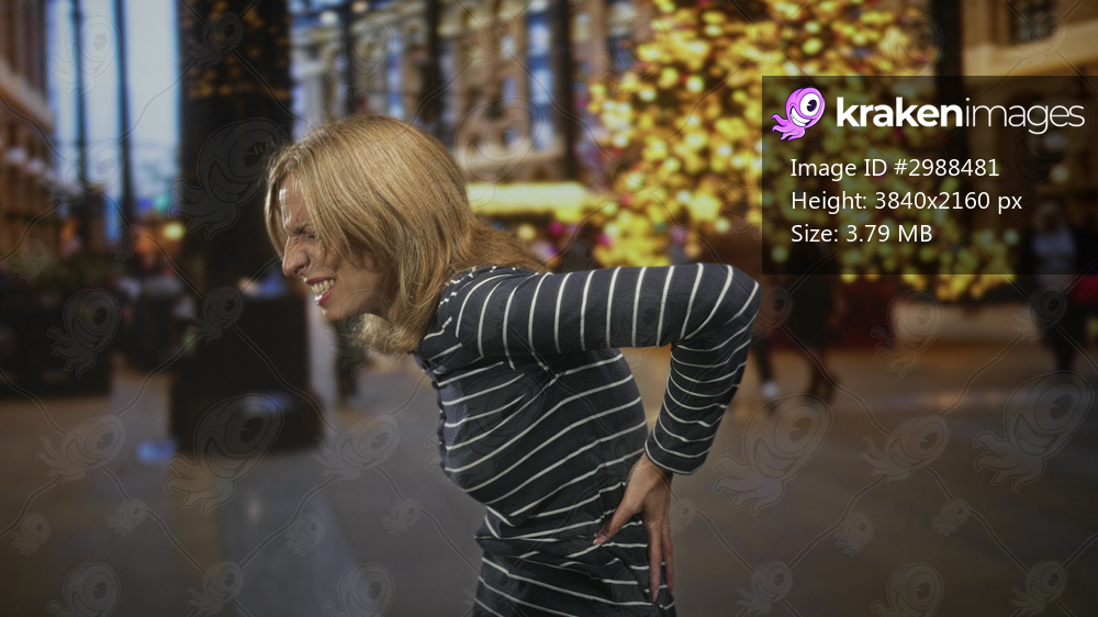 Woman holding hand to lower back and grimacing amid festive tree and blurred crowd in a building; pain backache.