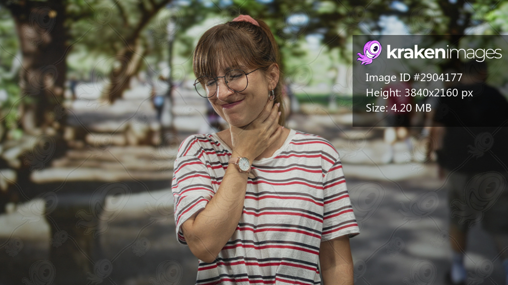 Woman holding hand to neck and grimacing on a tree lined street, wearing striped shirt and glasses; discomfort.
