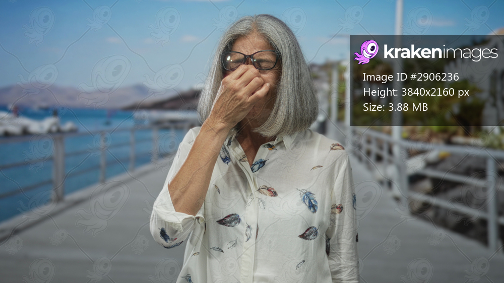 Woman holding hand to throat, coughing on street pier boardwalk beside boats at port; discomfort breathing.