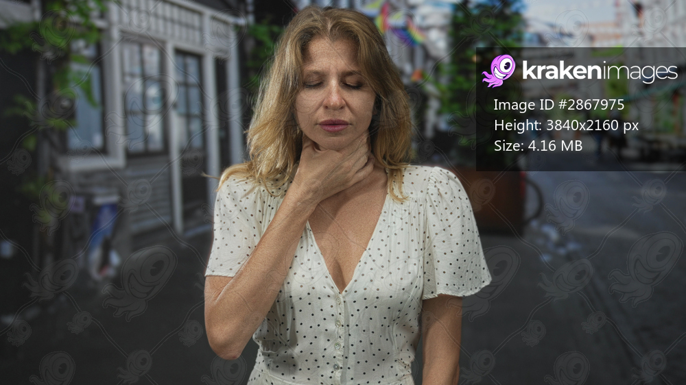 Woman holding hand to throat on city street, eyes closed in a white polka dot dress; pain medical concern.