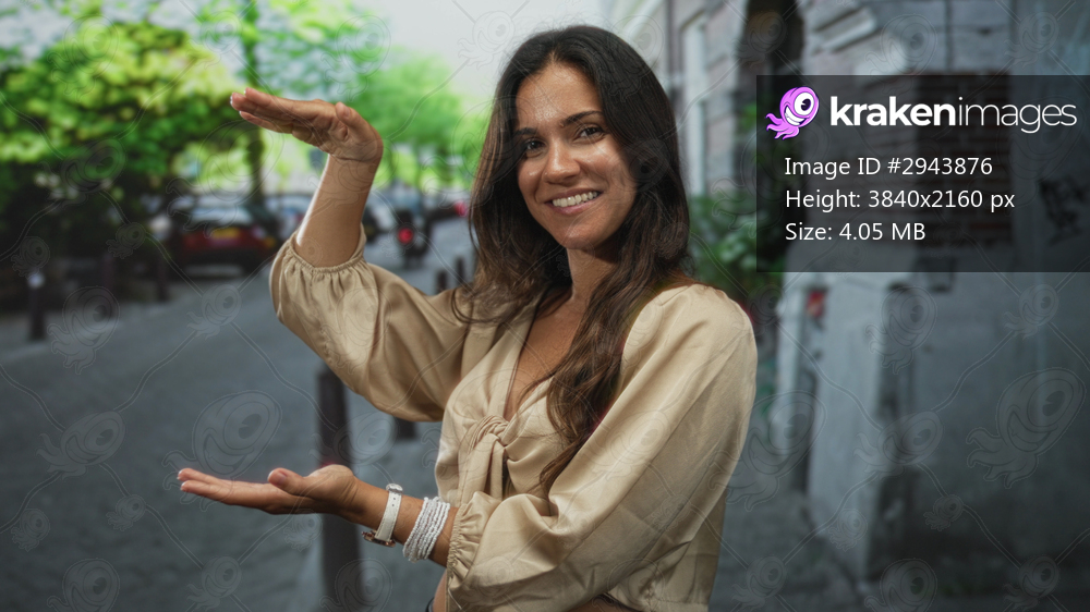 Woman holding hands apart on street, smiling and gesturing with palms framing an invisible object; serenity.