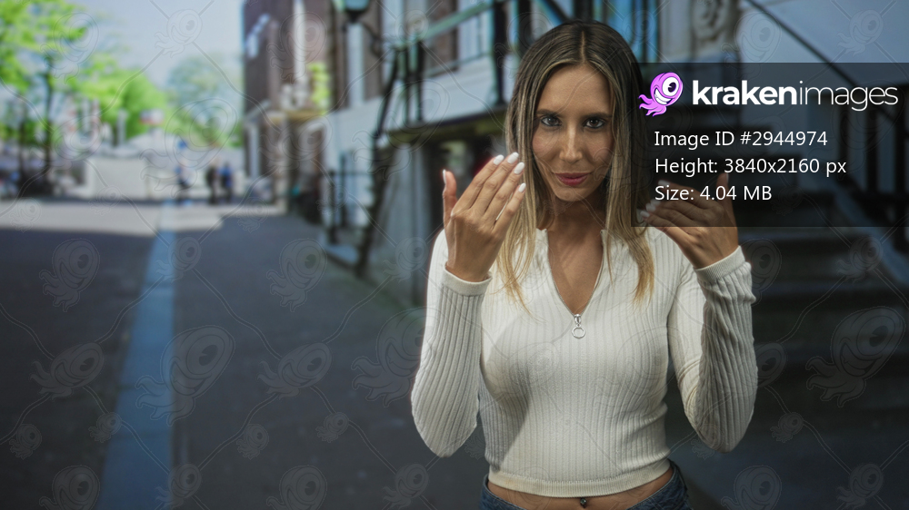 Woman holding hands near face showing nails and belly button piercing on a street by building steps, mid urban scene; confidence.