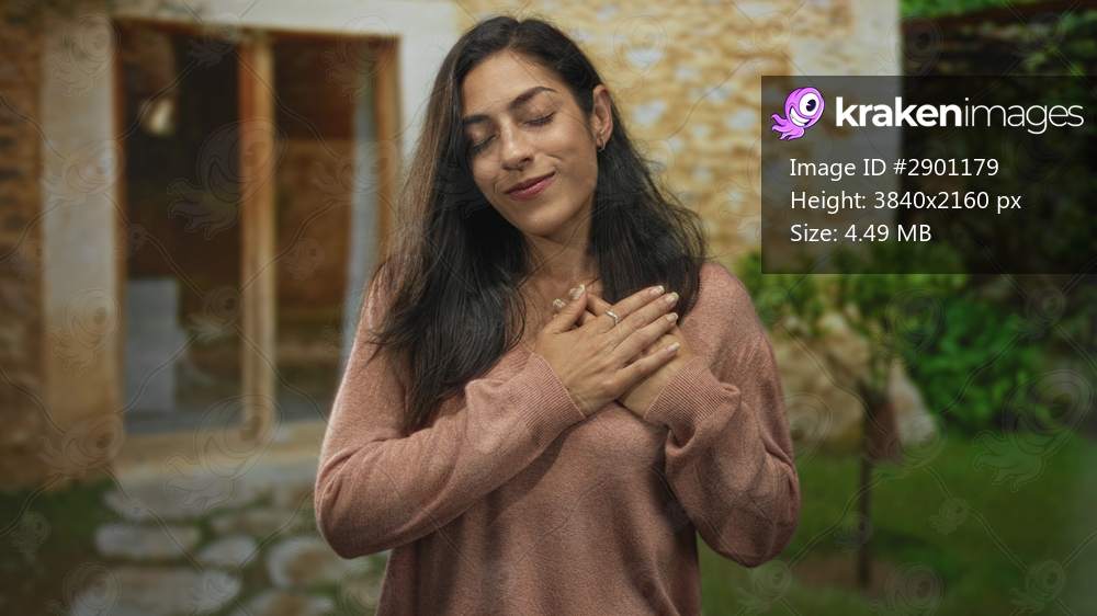 Woman holding hands over chest at house entrance, eyes closed with a gentle smile, long dark hair, cozy sweater and stone steps outdoors; gratitude home. - Kraken Images