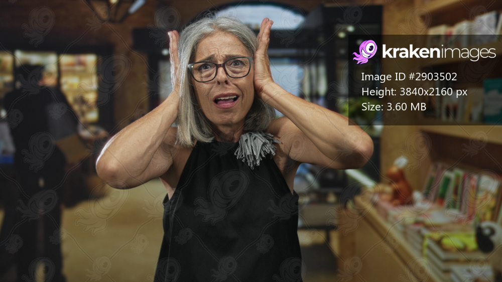 Woman holding hands over ears in library building, grimacing amid bookshelves and raised arms; sensory overload frustration.