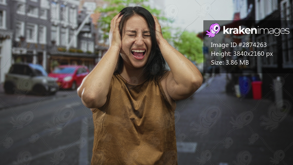 Woman holding hands to ears on a busy city street near parked cars and shops; stress overload noise.