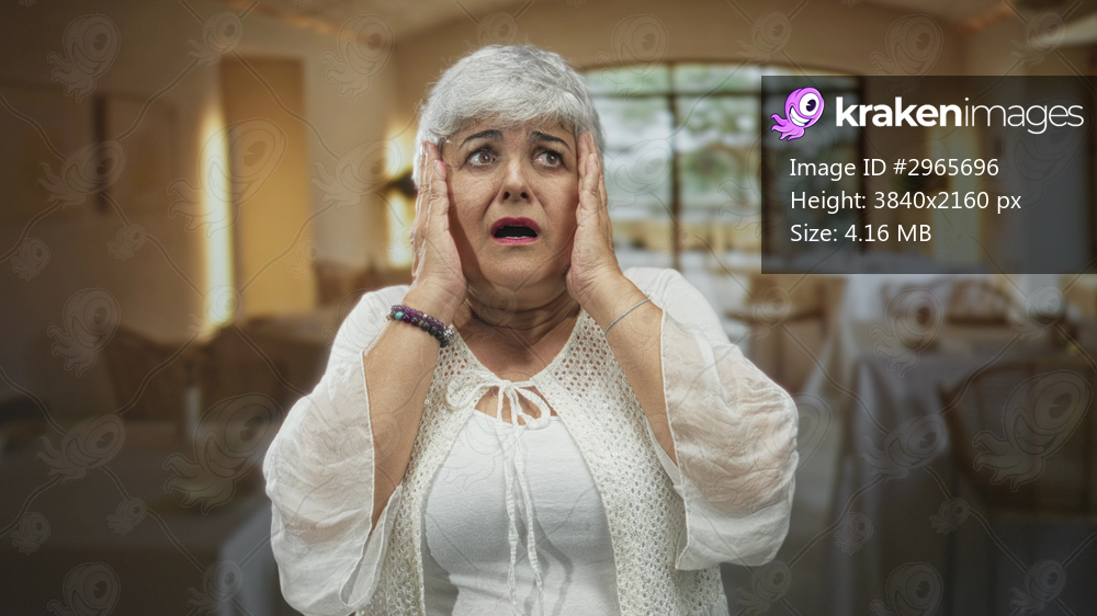 Woman holding hands to face and looking upward in a restaurant building dining room with bare forearms visible; anxiety vulnerability.